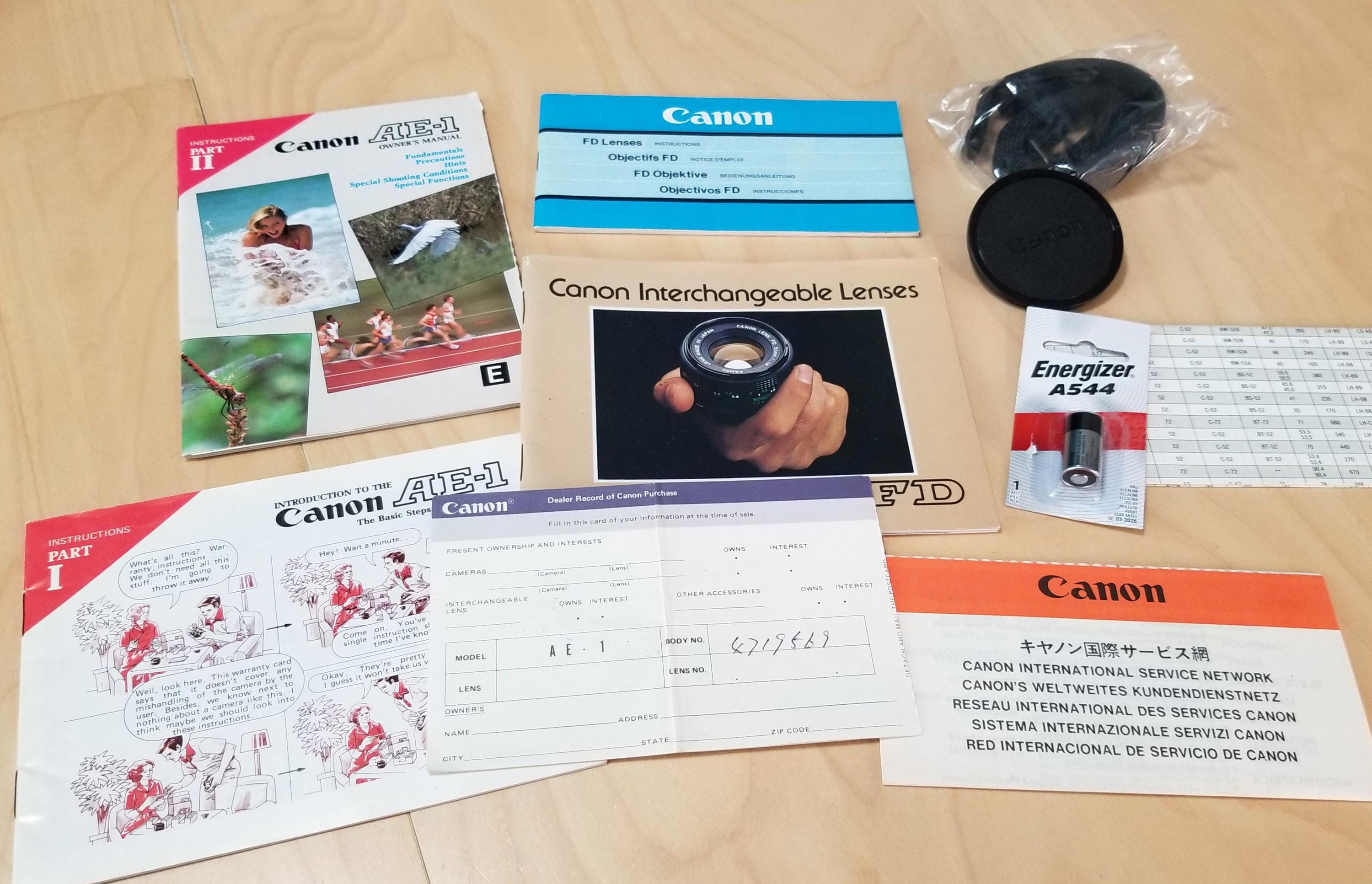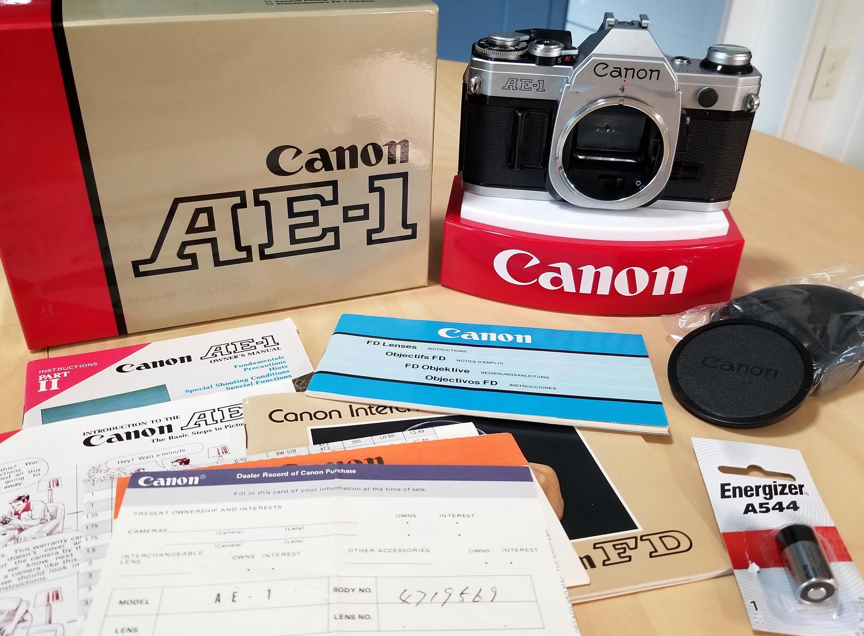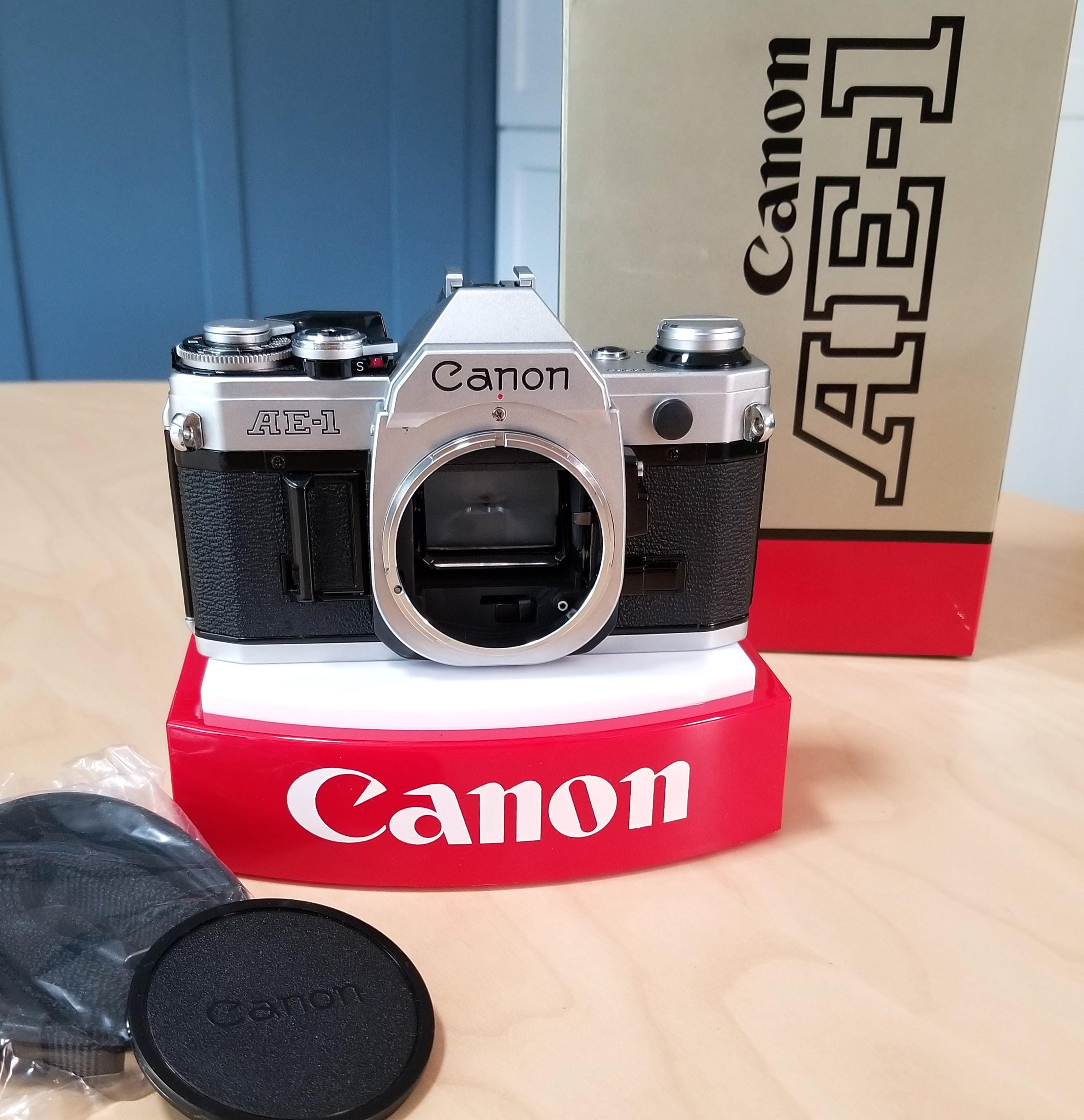 Classic Boxed Canon AE-1 35mm SLR Camera w/ Canon Body Cap - Film Tested, New Battery, Canon Strap, All Books, Card - Minty Fresh