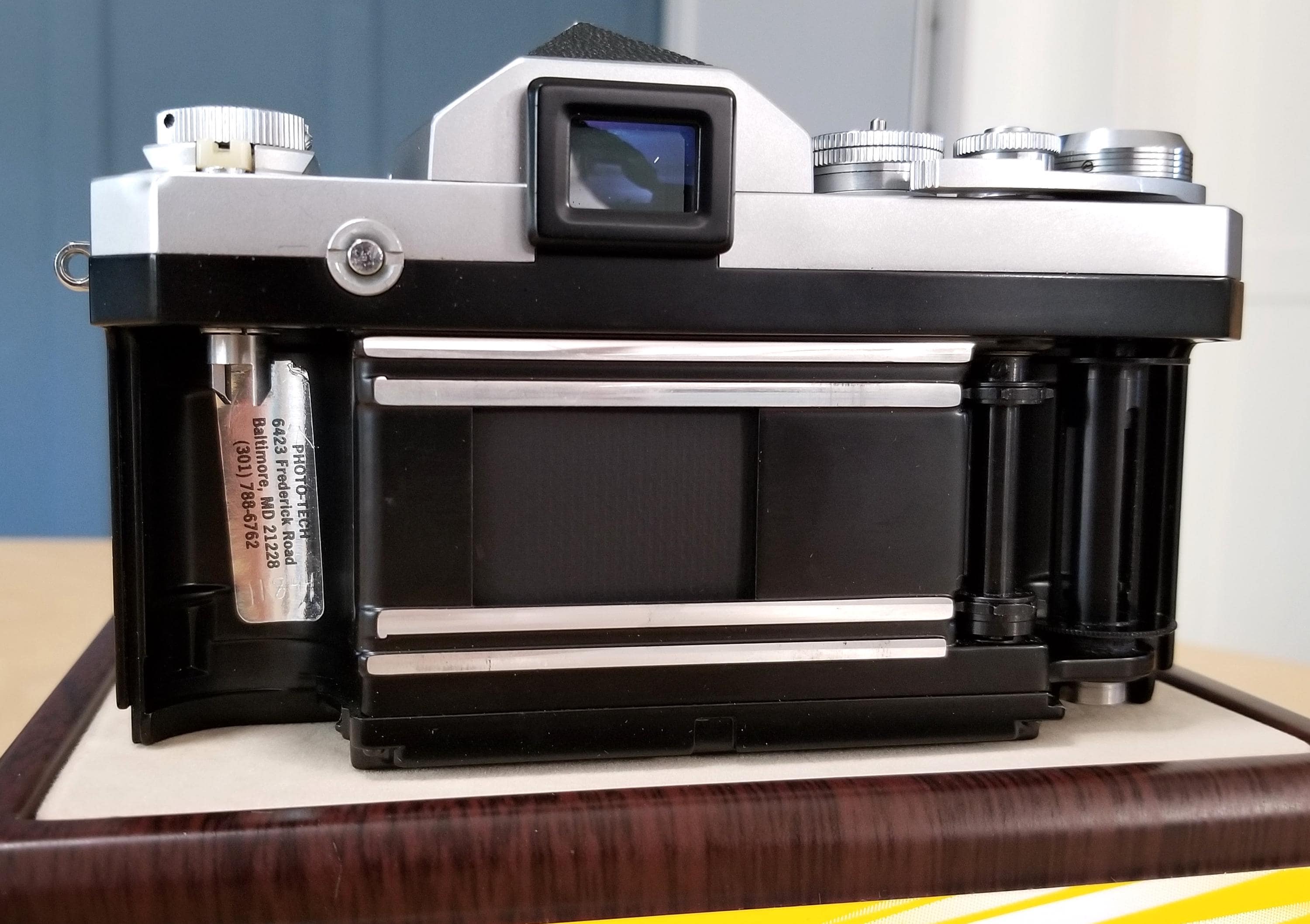 The viewfinder can be swapped for a metered finder, such as a Nikon Photomic meter. I have a Nikon DW-2 6x finder for it, listed separately.